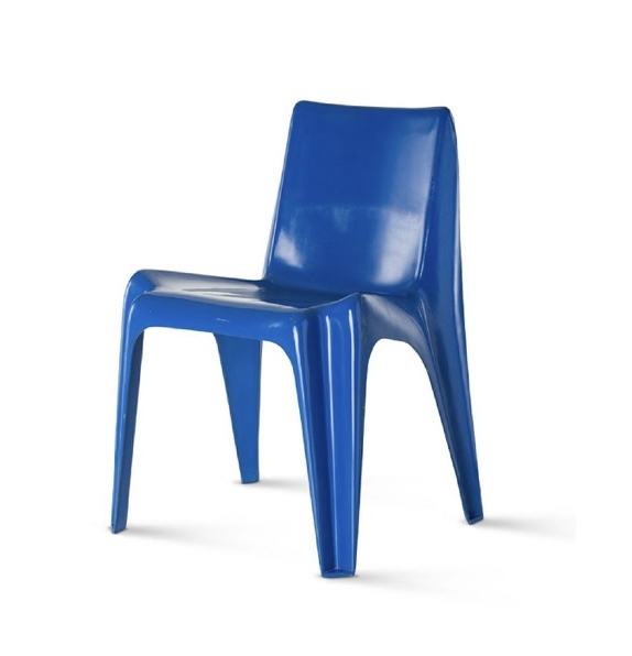 Der Bofinger-Stuhl, im Sommer 1966 grafisch inszeniert von Karl Oskar Blase auf dem Titel von form 34, war Mitte bis Ende der 60er Jahre eine vielbeachtete Neuheit und ist bis heute design-historisch relevant, da er der erste Stuhl war, der komplett aus Kunststoff gefertigt wurde. Damit ist er zum Vorbild von etlichen Monobloc-Varianten geworden, von denen allerdings die allermeisten unter ästhetischen Gesichtspunkten zu vernachlässigen sind. Weniger elegant und weniger skulptural als der Panton Chair, ist dem Bofinger-Stuhl seine Fertigungstechnik klar anzusehen. Warum? Die Form war das Ergebnis der Abarbeitung von Anforderungen: Stapelbarkeit und Belastbarkeit – und jener der damals wohl einzig sinnvollen Herstellungsweise. Mathias Remmele beschreibt im „Atlas des Möbeldesigns” das sogenannte Prepreg-Verfahren, das beim Bofinger-Stuhl zum Einsatz kam: „Hierbei wurden vorfabrizierte, in durchgefärbtem Polyester getränkte Glasfasermatten verwendet. Diese wurden in einer Pressform aus geschmiedetem Stahl mit einem Druck von über 300 Tonnen und bei einer Temperatur von ca. 145 Grad Celsius geformt. Nach dem Pressvorgang, der nur fünf bis zehn Minuten dauerte, mussten nur noch die Kanten des Stuhls abgeschliffen werden”. Der Name seines Designers ist leider heute fast so gut wie vergessen, denn wiederum anders als beim Panton Chair, war nicht ein Herr Bofinger der Gestalter, sondern ein Karlsruher Architekt namens Helmut Bätzner (1928-2010). Bofinger indes war der Name der Firma, die half, den ersten Monobloc zur Produktionsreife zu führen und lange vertrieben hat. Kurioserweise steht der Bofinger-Stuhl in enger Verbindung mit einem renommierten Bauprojekt Helmut Bätzners: dem Badischen Staatstheater. Denn für diesen Kulturbau wollte der Architekt eigens eine vielfältig nutzbare Bestuhlung entwerfen – und begann um 1964/1965 mit der Entwicklung eines leichten und preiswerten Stapelstuhls. Der Rest ist Geschichte. Auch wenn der BA 1171 besonders in den 1970er Jahren in vielen Cafés, Krankenhäusern und Kantinen zu finden war, schien er im hochkulturellen Umfeld des Staatstheaters wohl etwas fehl am Platze. Dort kam er, laut Remmele, nie zum Einsatz. Die Produktion begann im April 1968 und sollte erst 1984 enden. Andere, noch billigere Kunststoffe, die sich weniger aufwändig verarbeiten ließen, kamen in Mode. Sein Ende war besiegelt. Aber siehe da: die angesprochenen Zeitungs- und Magazinartikel über Dieter Rams, die Kameraschwenks in Filmbeiträgen, haben gerade die blaue Variante unter Braun-Sammlern begehrenswert gemacht. Und so werden heute noch zahlreiche Exemplare von ihren Besitzern gepflegt und hochgeschätzt. Ganz gleich aus welchen Gründen: die sorgsame Langzeit-Nutzung, über Jahrzehnte, ist besser als jedes vorschnelle Recycling.
