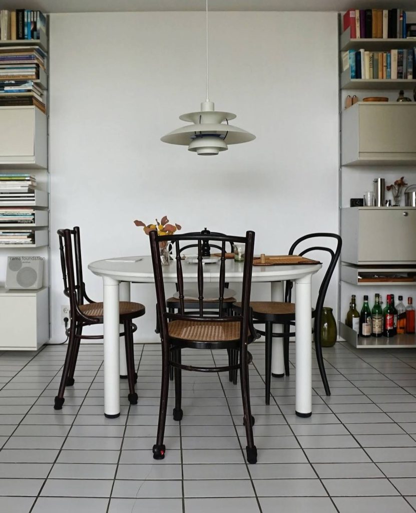 When considering his many lighting designs, most of which feature a concentric structure of staggered shades, not every model may be convincing from today’s perspective. In some of his models, the idea of shading using cascades of sheet metal is taken to almost absurd extremes with their particularly expansive and sculptural qualities. His Paris Lamp, which was presented at a trade fair in the French capital in 1925, demonstrates precisely what makes his PH5 so ideal as a living room lamp, yet without the same understated calm and elegance. A pendant lamp in particular is not in use for much of the day—especially when daylight makes switching it on unnecessary. And this is where the image of the ‘English butler’ that is frequently used in connection with Braun’s design from 1955 comes into play, maintaining a discreet background presence when not needed. The PH5 is a brilliant example of this too. Nevertheless, a device that is not switched on remains visible. Therefore, the outer form of a product still performs a functional role when it is not in use. This is clearly illustrated by photos of the lamp above the Vitsœ 720 dining table in the home of Rams.